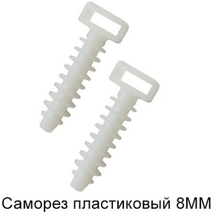 Саморез пластиковый 8MM используется для крепления кабельных хомутов шириной до 9мм при необходимости крепления кабелей на бетонные, деревянные, кирпичные и им подобным несущие поверхности.