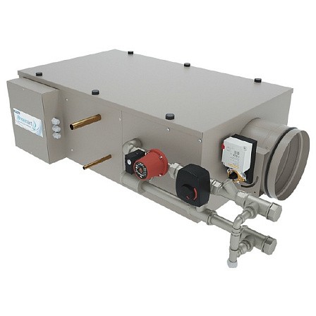 Приточные установки с фреоновым охладителем, водяным нагревателем и смесительным узлом с 2-х или 3-х ходовым клапаном (узел подбирается исходя из типа теплоснабжения), комплектуется воздушным клапаном с электроприводом (с возвратной пружиной), системой цифровой автоматики JetLogic с цветным сенсорным пультом управления и всеми необходимыми датчиками. Автоматика может управлять различными типами ККБ и увлажнителем воздуха.