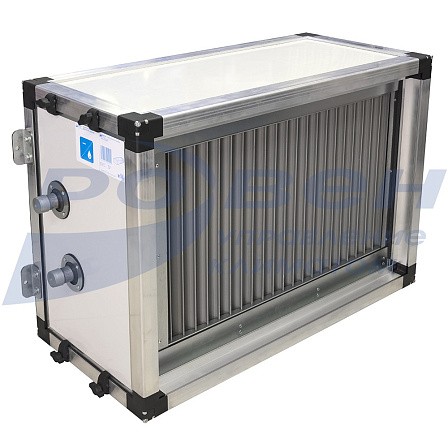 * Значения приведены при условиях: температура наружного воздуха +30°C; температура воздуха на выходе из нагревателя +21°C; относительная влажность наружного воздуха 45%, температура кипения фреона + 7°C, хладоноситель 7/12°C. Расчёты произведены при скорости воздуха в сечении теплообменников 4 м/с.