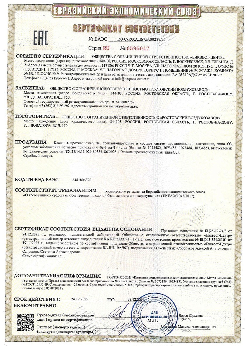 Сертификат соответствия ОЗ ТР ТС 043 "О требованиях к средствам обеспечения пожарной безопасности и пожаротушения"