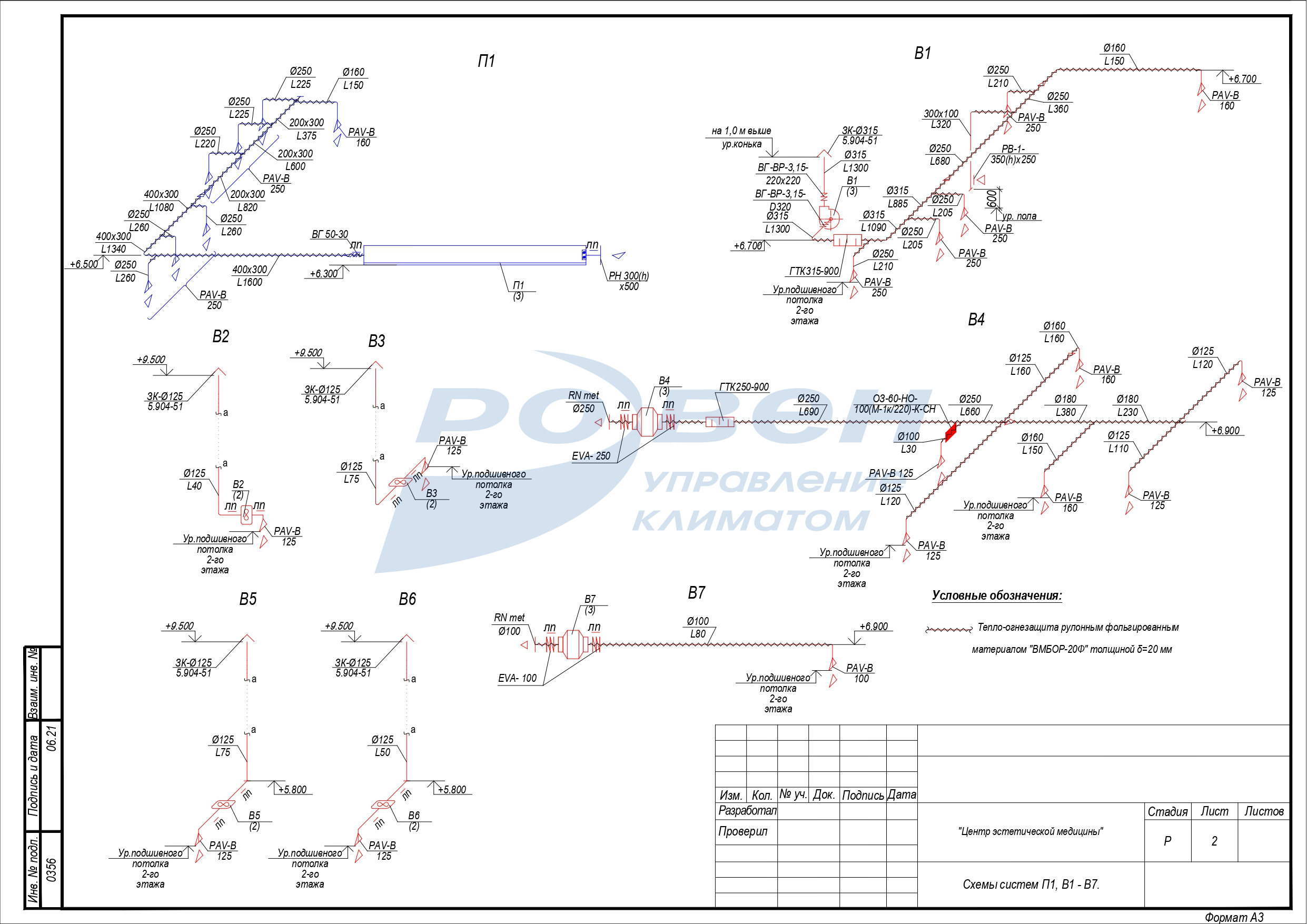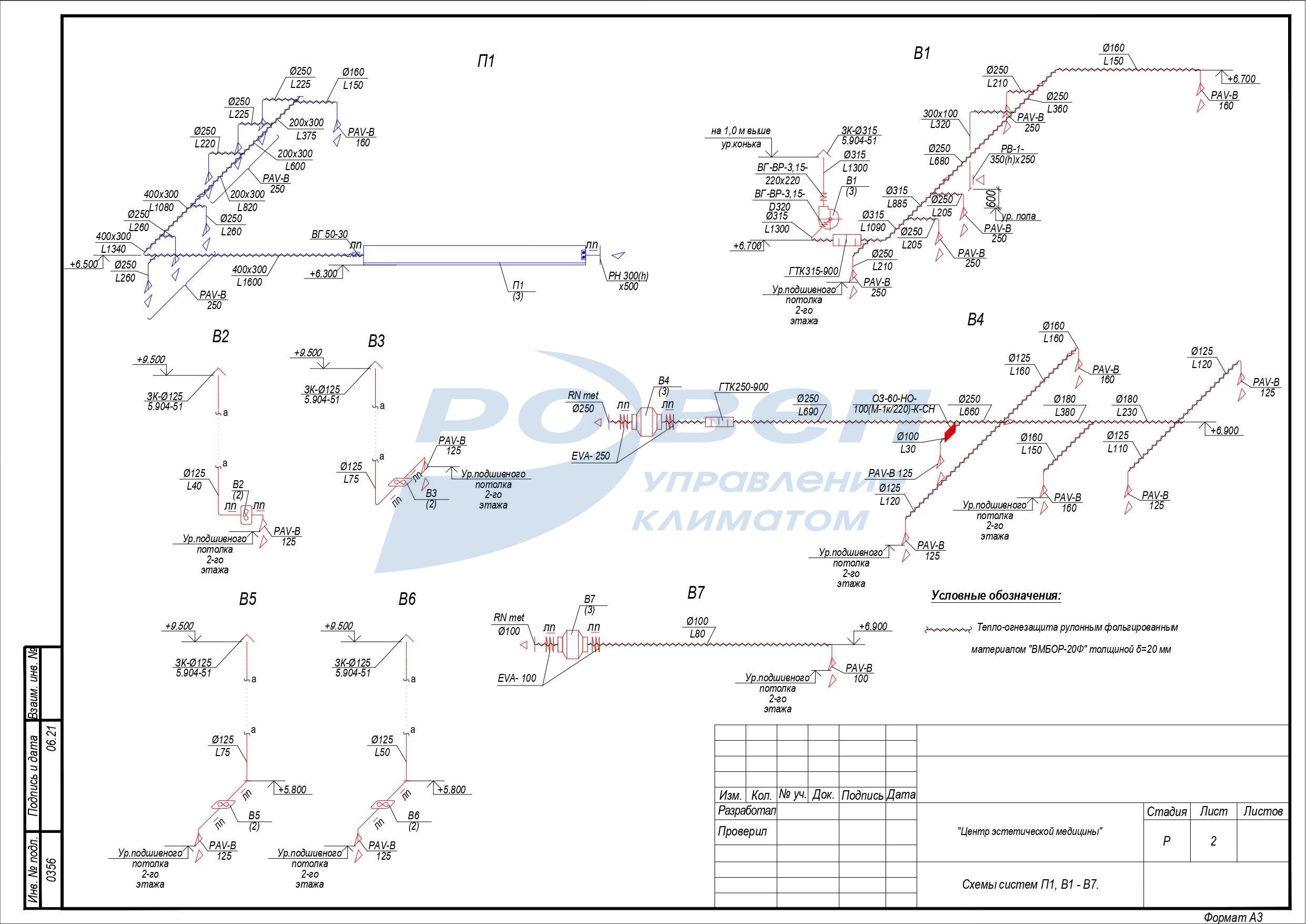 Удаление воздуха из верхней зоны кабинетов (В4-690м3/ч). Из операционной предусматривается из двух зон: 40% - из верхней, 60% - из нижней зоны (В1-1300м3/ч). Из душевой, санузла и комнат хранения отходов канальными вентиляторами.<...